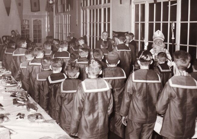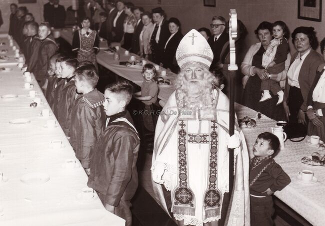 Sinterklaas in de eetzaal van de Ibisschool.De kleine jongen achter de goedheilig man kijkt ietwat wijfelend.