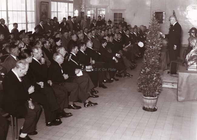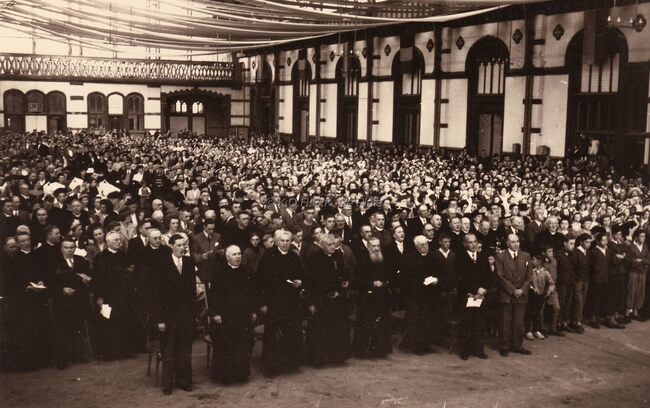 Binnenzicht in de Albert Hall,het oud stationsgebouw aan het Ernest Feysplein, tijdens een bijeenkomst.Blijkbaar wordt een lied gezongen (de brabanconne ?).Links vooraan Jan PIERS,burgemeester met naast zich deken BUTAYE…