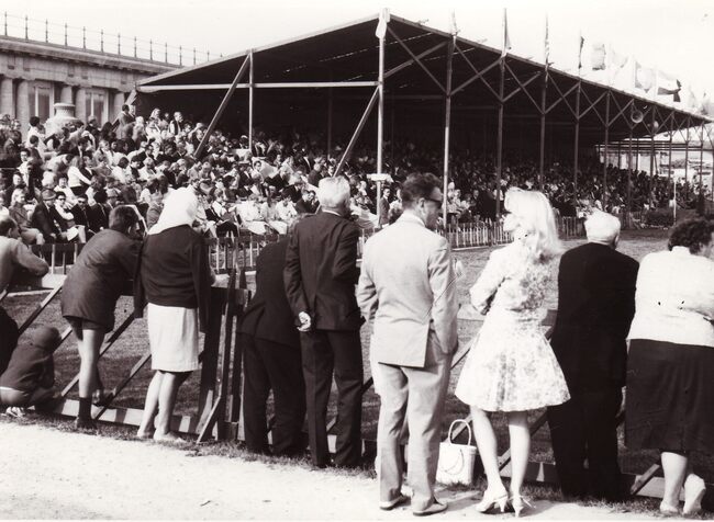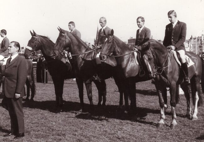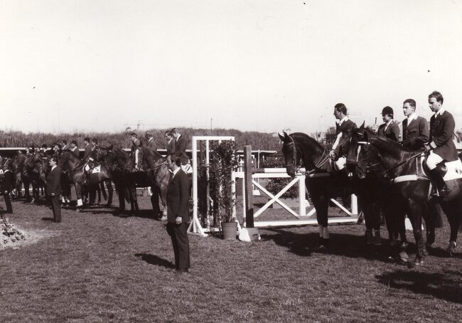 Formaat : 13 x 18 cm. - Deelnemers aan een jumpingwedstrijd in het plantsoen van de Koninklijke Gaanderijen aan de Koningin Astridlaan.