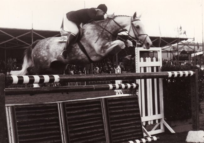 Formaat : 18 x 13 cm. - Ruiter Arthur Seynaeve gaat met zijn paard over een hindernis tijdens een springwedstrijd in het plantsoen van de Koninklijke Gaanderijen aan de Koningin Astridlaan.