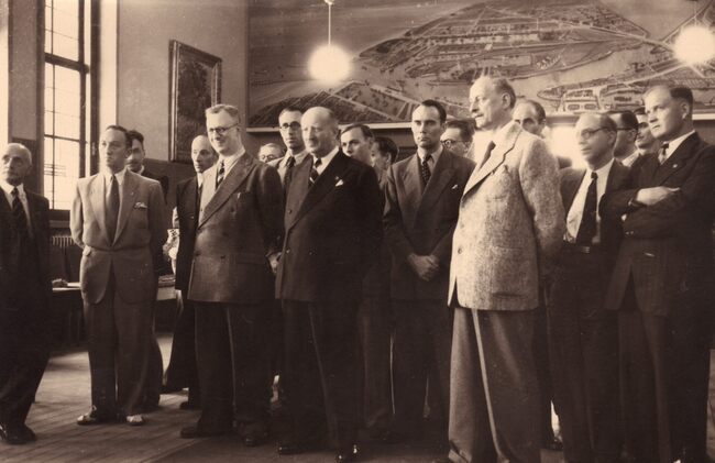 De eetzaal van de Ibisschool tijdens de ontvangst van Prins Alexander naar aanleiding van vijftig jaar Ibis op 30 oktober 1956. Rechts naast de Prins, de voorzitter Ernest-John Solvay, Willy Weemaes, secretaris van…