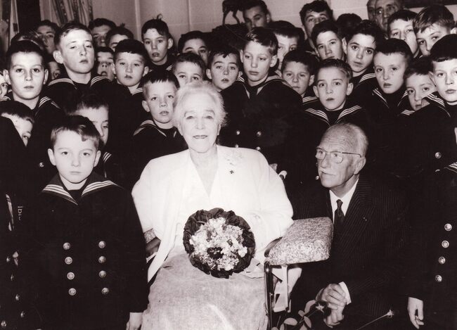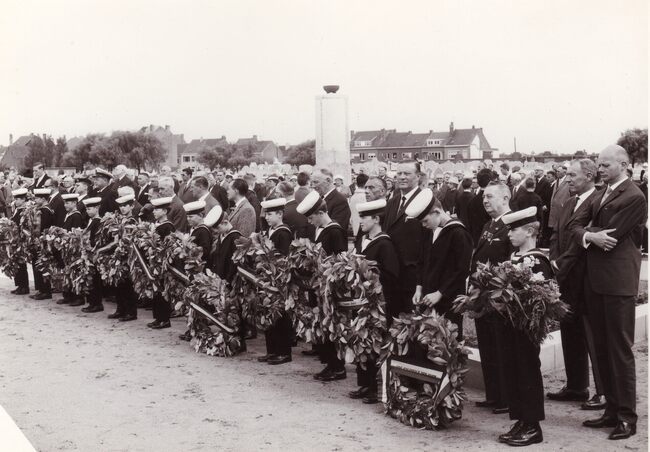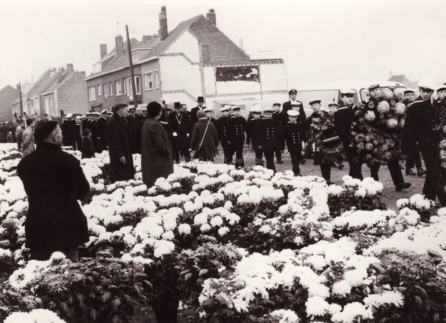 De leerlingen van de Ibisschool komen toe aan het Kerkhof Stuiverstraat voor de jaarlijkse hulde aan de op zee omgekomen vissers,achter de jongens burgemeester Jan PIERS,mét steek. Vooraan de chrysantenverkopers die…