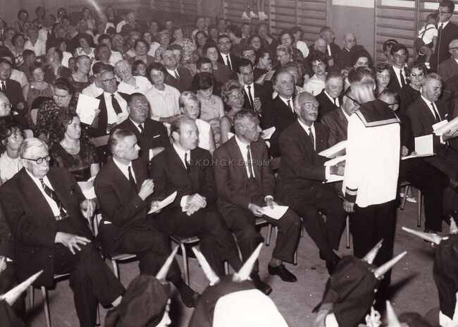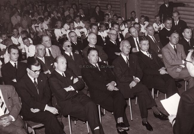Zicht op de turn (=feest) zaal van de Ibisschool tijdens een schoolfeest.Eerste rij derde van links August PLOVIE,burgemeester van Bredene,directeur Hubert CAESTECKER,houdt een toespraak.