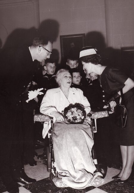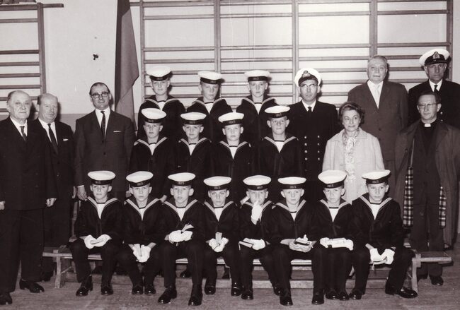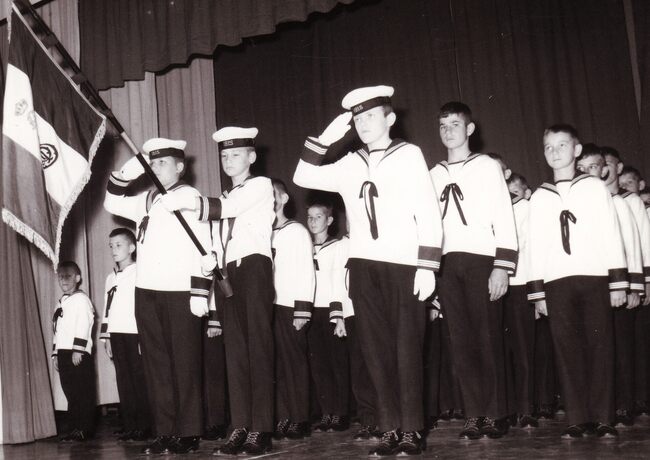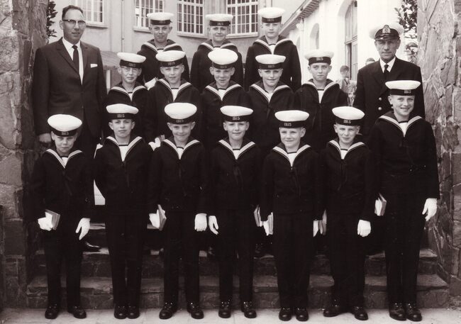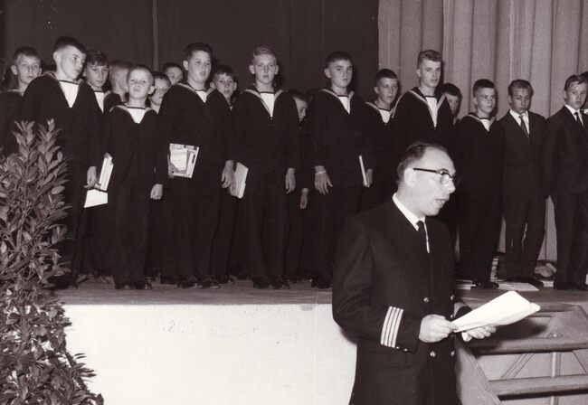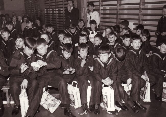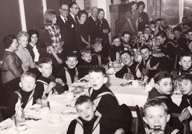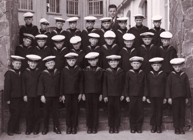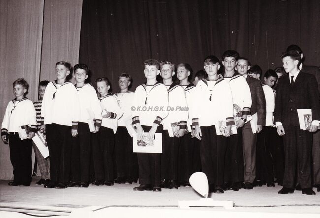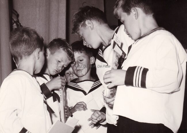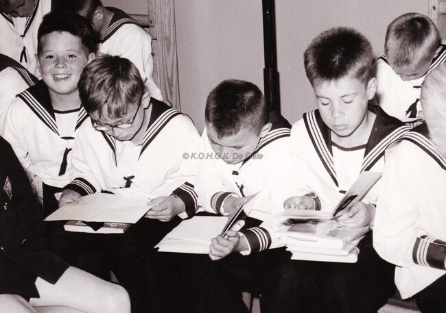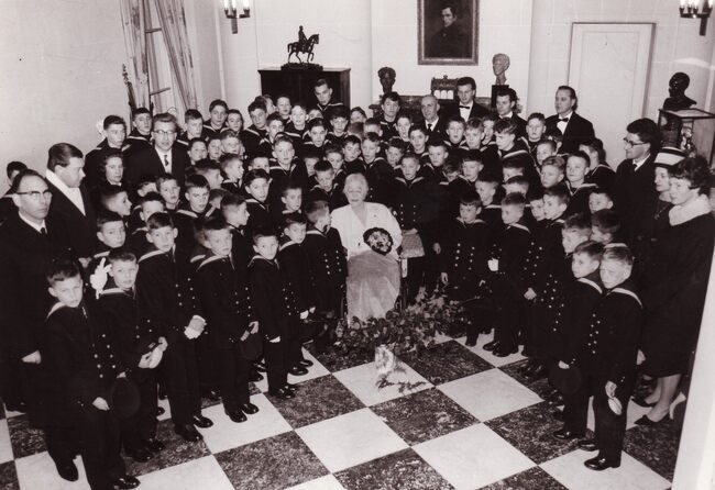 Formaat : 13 x 18 cm. - De leerlingen bezochten Het koninklijk paleis. "Het bezoek ging door op dinsdag 22 december 1964. Vijfentachtig jongens, piekfijn uitgedost in hun zondagsuniform, werden samen met…