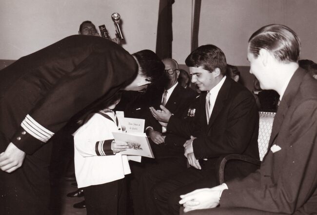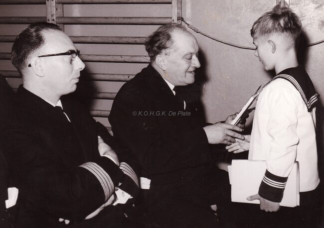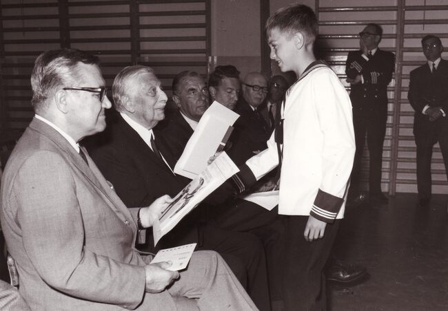 Prijsdeling in de Ibisschool door burgemeester August PLOVIE van Bredene,links directeur Hubert CAESTECKER.