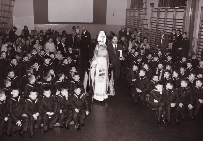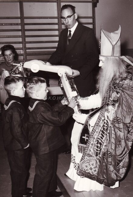 Sinterklaas in de Ibisschool.De kinderen krijgen snoep en cadeautjes.