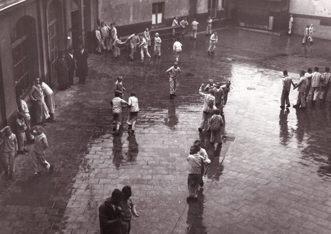 Formaat : 13 x 18 cm. - Speelplaats van de Ibisschool bij regenweer. Rechts achteraan de W.C.'s (urinoirs).