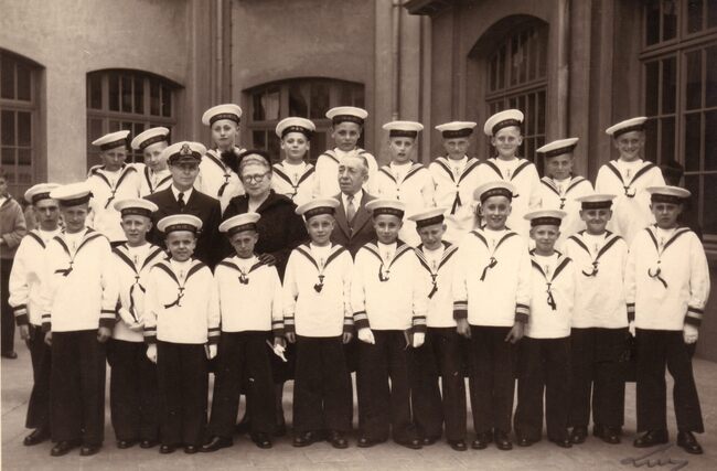 Formaat : 13 x 18 cm. - Plechtige communicanten poseren op de speelplaats.