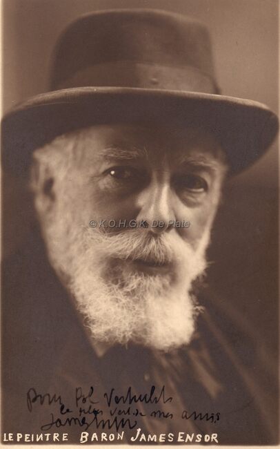 Portret van James ENSOR met een opdracht voor Pol VERHULST.