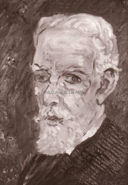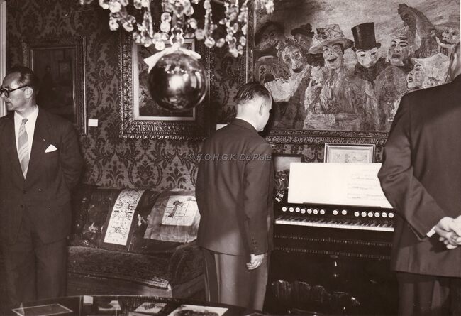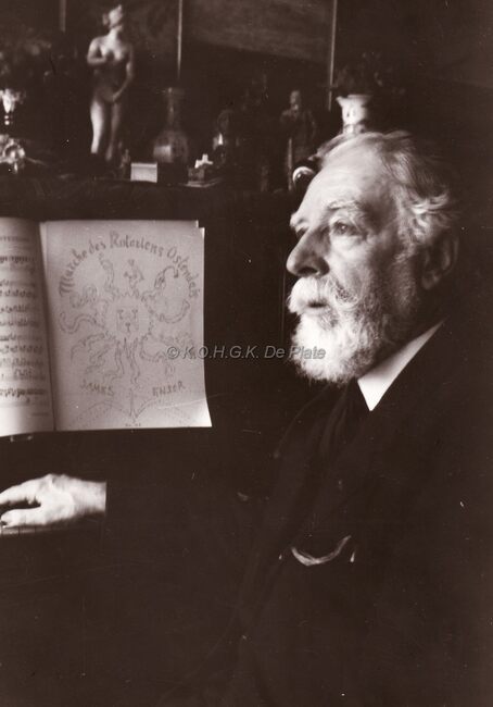 Portret van James ENSOR aan het harmonium in zijn leefkamer,op het instrument het door hem gecomponeerd stuk : Mars van de Oostendse Rotary.