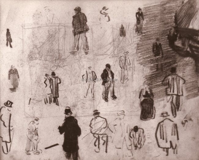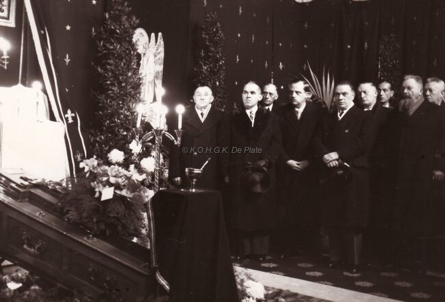 Begrafenis van James ENSOR.De kist in de rouwkapel.tweede van links Adolf VAN GLABBEKE,achter hem Henri EDEBAU.