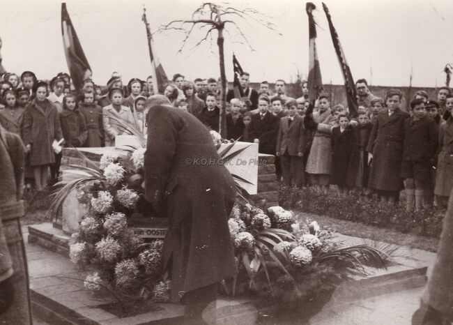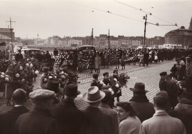 Herdenking van James Ensor. Burgemeester Hendrik Serruys legt een krans op het graf bij de Duinenkerk. De Oostendse schooljeugd, mét vaandels, is aanwezig.