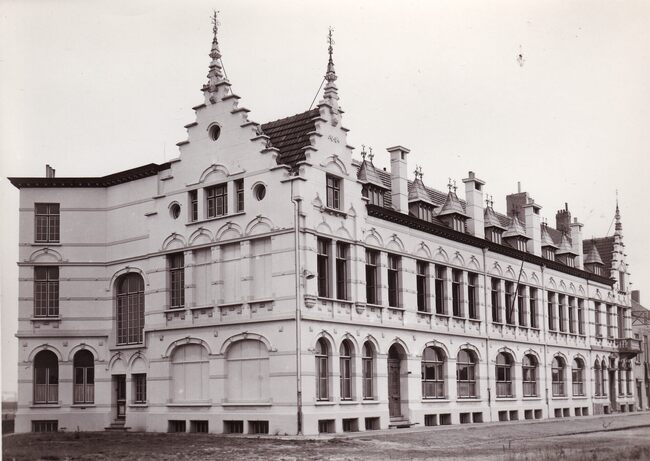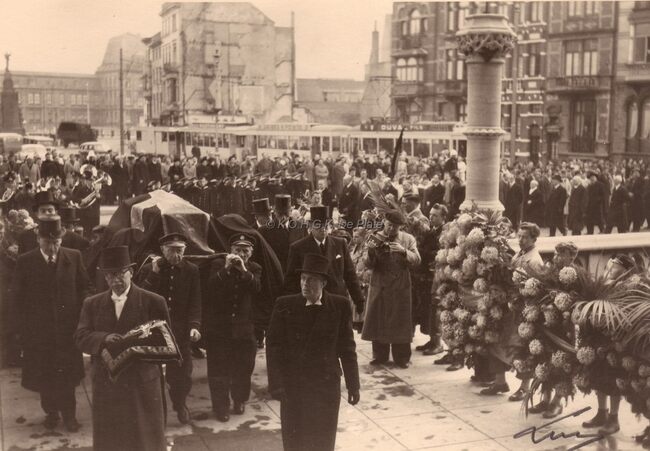 Begrafenis van James Ensor. De stoet in de Jozef II-straat komt aan bij de Sint Petrus en Pauluskerk. Op de achtergrond de Sint-Pietersstraat.