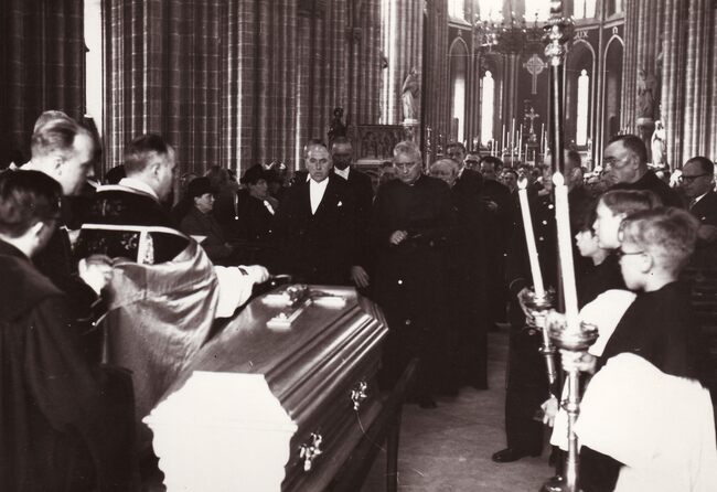 Begrafenis van Robert ELLEBOUDT. De lijkkist wordt gezegend door celebrant Karel MARTENS ,de latere pastoor van het Heilig Hart, in de Sint Petrus en Pauluskerk. Links vooraan de kerkbaljuw Alfred DESMIT.