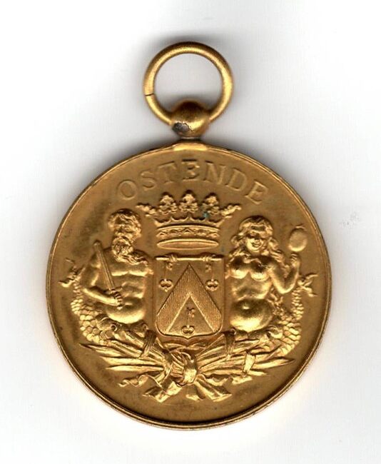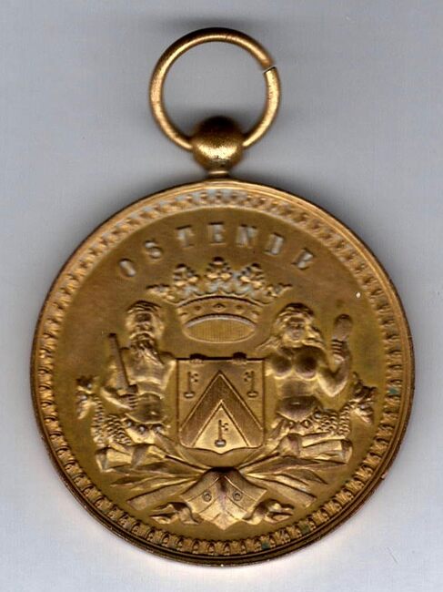 Op de voorzijde : rondom boven OSTENDE, centraal het gekroonde wapenschild met keper en drie…