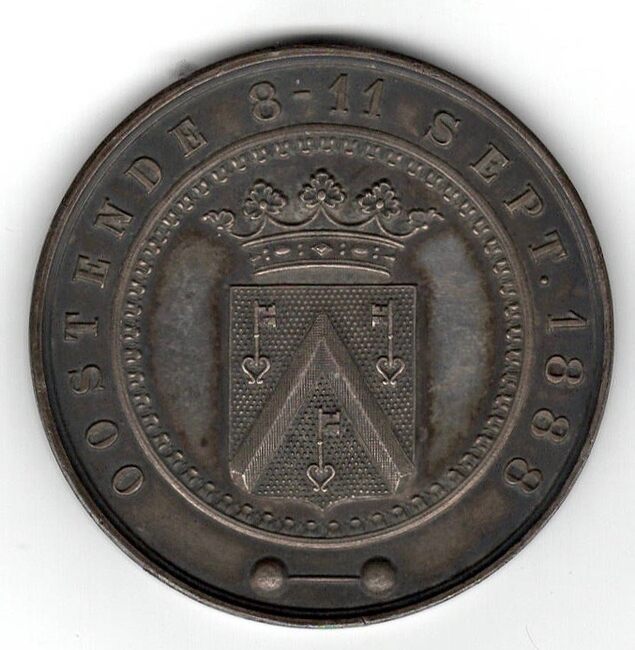 Op de voorzijde : rondom OOSTENDE 8-11 SEPT. 1888, midden onder ●— ●, centraal het gekroonde wapen met keper en drie…