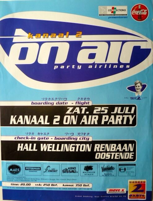 Affiche : Kanaal 2 on air party airlines. Hall Wellington renbaan Oostende. 25 juli
