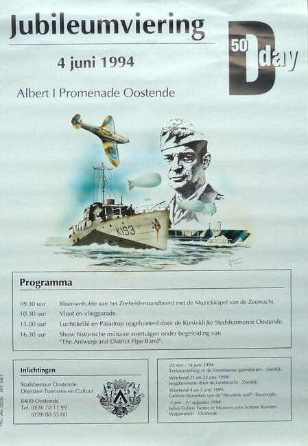 Affiche : Stadsbestuur Oostende. Jubileumviering 50 D day. Albert 1 Promenade Oostende. 4 juni 1994.
