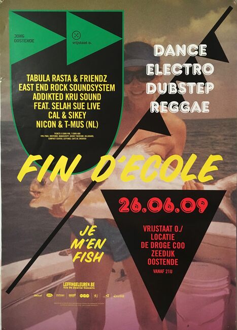 Affiche : Fin D'école. Dance Electro Dubstep Reggae. Vrijstraat O.. Op 26 juni 2009