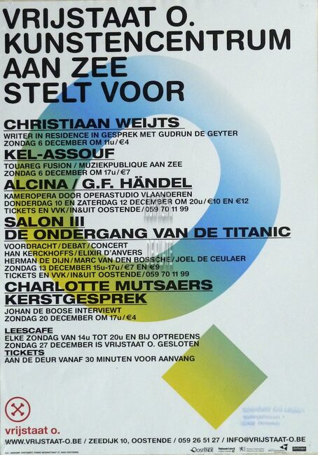 Affiche : Vrijstaat O. Kunstcentrum aan zee stelt voor. Programma. 6, 10, 12, 13, 20 en 27 december .... (?)