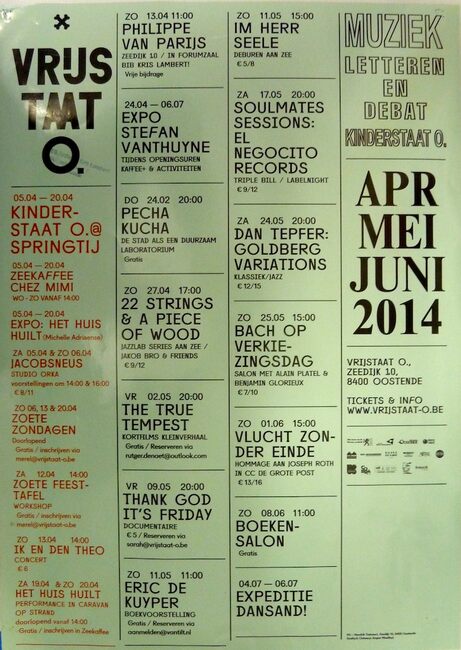 Formaat : 60 x 42 cm. Grafisch ontwerp : Jurgen Maelfeyt. 05/04 : Kinderstaat O.@Springtij, Zeekaffee Chez Mimi, Expo : Het huis huilt (Michelle Adriaense). 05-06/04 : Jacobsneus, studio Orka. 06, 13/04…