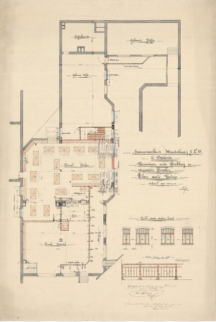 Blauwdruk. Plan met berekeningen voor het (ver)bouwen van het gebouw Bakkerij Aamsterdamstraat. R. Vandermersch. 12 Boulevard de L'Escaut Gand.