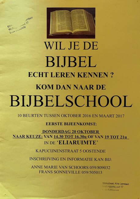 Affiche : Bijbelschool. Wil je de bijbel leren kennen ?. Eliaruimte. 10/2016-03/2017
