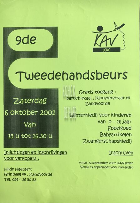 Affiche : Hilde Haezaert. Tweedehandsbeurs. Parochiezaal. Op 6 oktober 2001