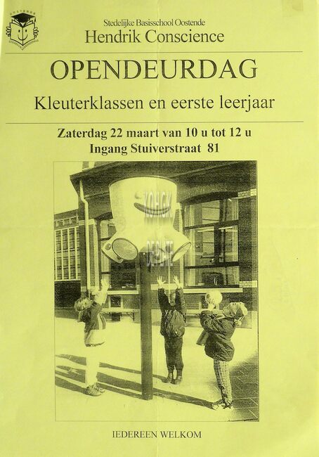 Affiche : Stedelijke Basisschool Oostende Hendrik Conscience. Opendeurdag kleuterklassen en eerste leerjaar. Stuiverstraat 81. 22 maart .... (?)
