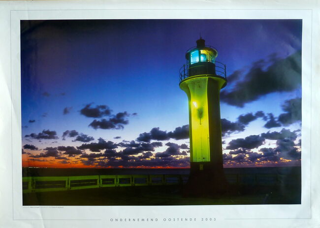 Formaat : 40 x 60 cm. - Rechts, detail van de vuurtoren "Lange Nelle", de havengeul en het Klein Strand. De woontoren "Europacentrum" in de Van Iseghemlaan