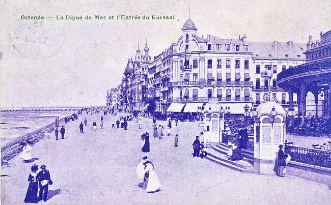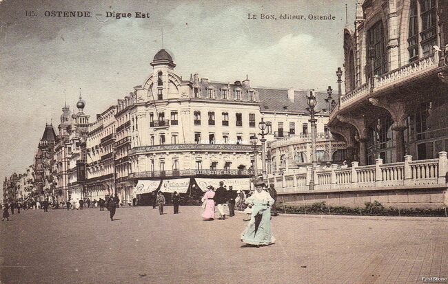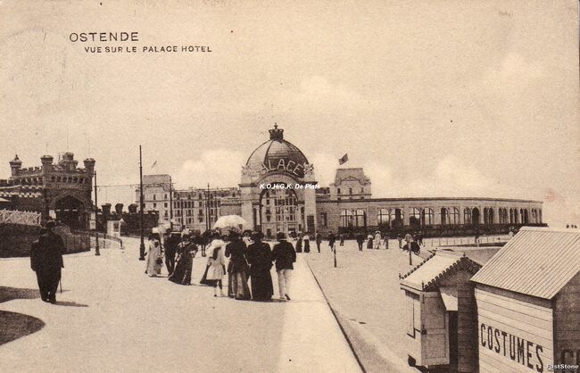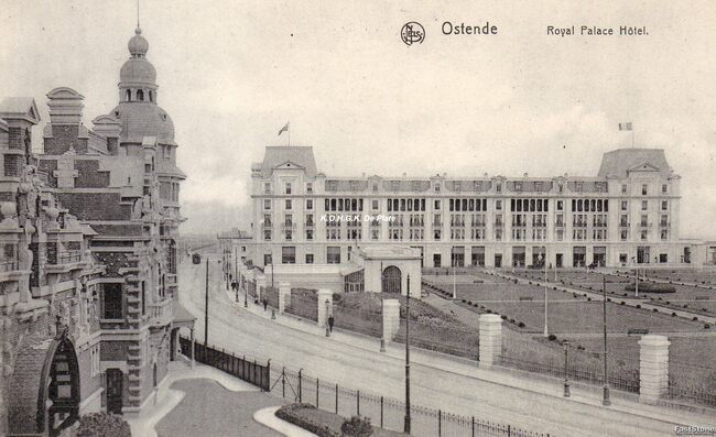 Ostende - Vue sur le Palace Hôtel. De Zeedijk, met rechtdoor de ingang van het Royal Palace Hotel en links, de ingang van de Wellingtonrenbaan