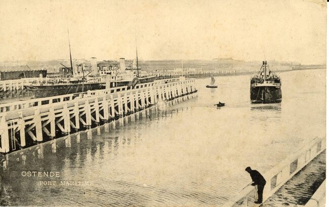 Ostende - Port maritime. E en vrachtschip richting de zeesluis die toegang gaf tot het Vlotdok. Links een pakketboot aan de kaai nabij het Zeestation.