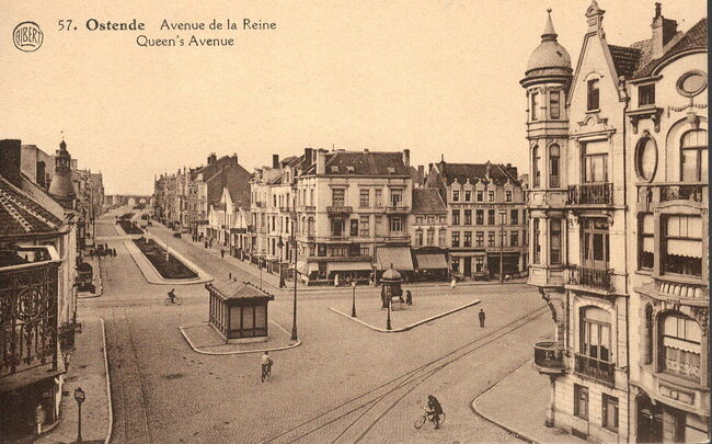 Albert Dohmen 57. - Ostende.- Avenue de la Reine. Queen's Avenue. De Koninginnelaan gezien vanaf het kruispunt Petit Paris richting Drie Gapers. De werken voor deze laannamen een aanvang op 28 mei 1888. (…