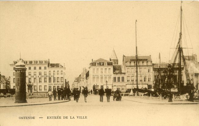 Ostende - Entrée de la ville. De Kapellebrug en rechtdoor de Kapellestraat. De Kappellebrug was de verbinding tussen het spoorwegstation gelegen langs de Vandersweepplaats en het centrum van de stad. Rechts, het…