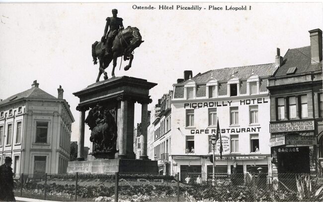 Ostende. Hôtel Piccadilly Place Léopold I. Gedeelte van het plein, gelegen tussen de Torhoutsesteenweg en de Kemmelbergstraat. Gevelopschrift : Piccadilly Hotel. Café Restraurant en rechts ernaasst Grand…