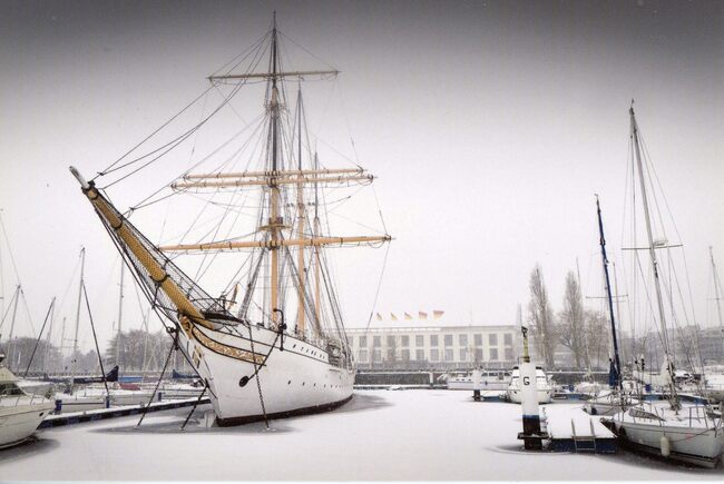 De mercator in een sneeuwlandschap in de Mercator jachthaven