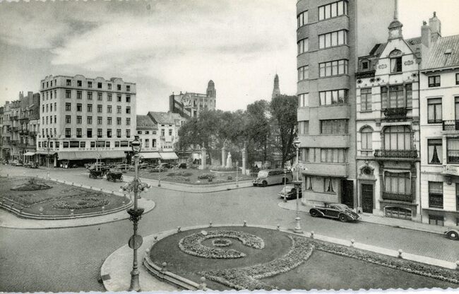 Ostende - La place d'armes. Het Wapenplein, met van links naar rechts : Les Grandes Galeries Belges, The Falstaff, Cercle Coecilia, Hotel restaurant Du Damier en de stadsbibliotheek op de hoek met de Louisastraat…