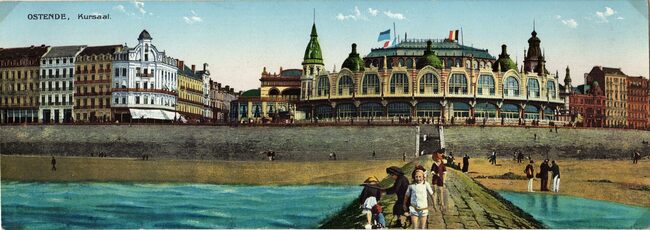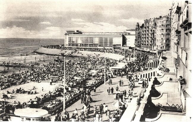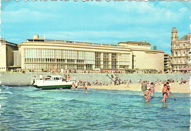 Joseph Corna/JC 6/23. De westgevel van het vierde Kursaal langs de Albert I-promenade gezien vanaf het groot strand. Met een amfibiebootje kon je een tochtje maken op zee