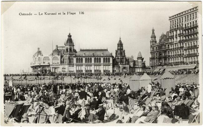 116. - Ostende - Le Kursaal et la Plage. Veel mensen genieten van het mooie weer op het groot strand in het interbellum. De westgevel van het derde Kursaal