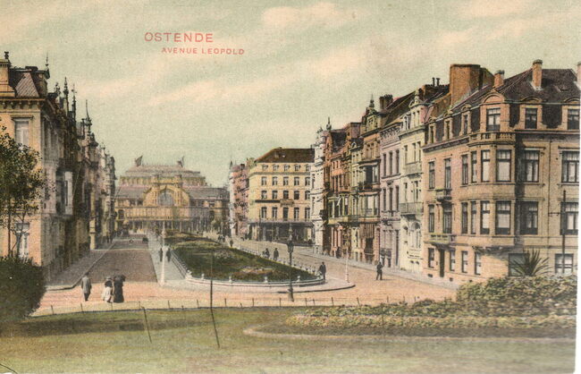 Ostende - Avenue Leopold. - Bijgekleurde kaart. - De Leopoldlaan gezien vanaf het Leopoldpark, richting de zuidgevel van het derde kursaal.