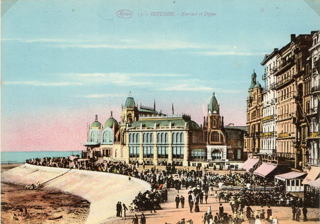 Marco Marcovici 53. - Ostende - Kursaal et Digue. - Bijgekleurde kaart. De westgevel van het derde Kursaal en de Zeedijk
