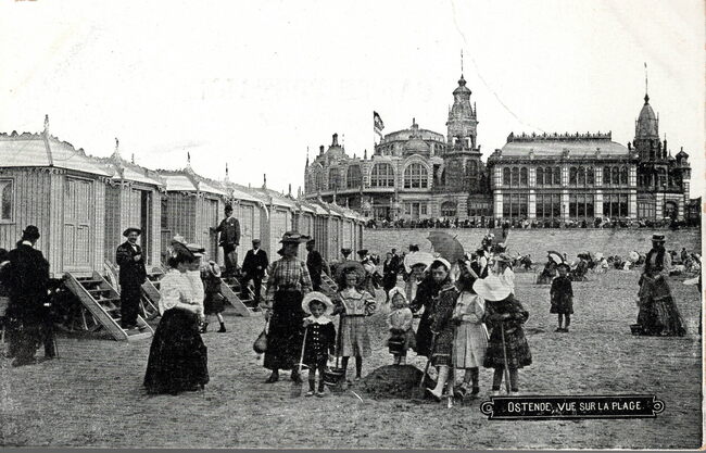 Victor Grégoire/V.G. - Ostende, vue sur la plage. - Strandrecreatie op het groot strand, met links de luxe badkarren. Zicht op de westgevel van het derde Kursaal
