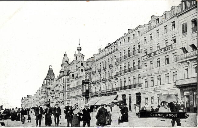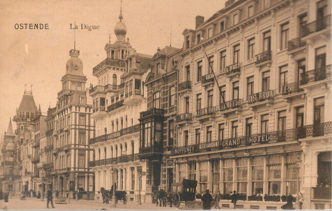 Ostende - La Digue. - Grand hôtel d'Ostende. Gevelopschriften : Grand hotel d'Ostende. Lift. Mème maison & cafe de Paris. Bruxelles. Noppeney. Restaurant. Grand hotel. Op de hoek met de Hertstraat…