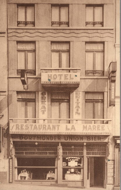 A. Montgomerency 3328. Ostende - (Près Digue). 39, Rampe de Flandre. Restaurant La Marée & Hotel Great Britain. Vue sur la Mer - Tout confort. Dîners à prix fixe et à la carte. Cuisine soignée faite par le Patron.…