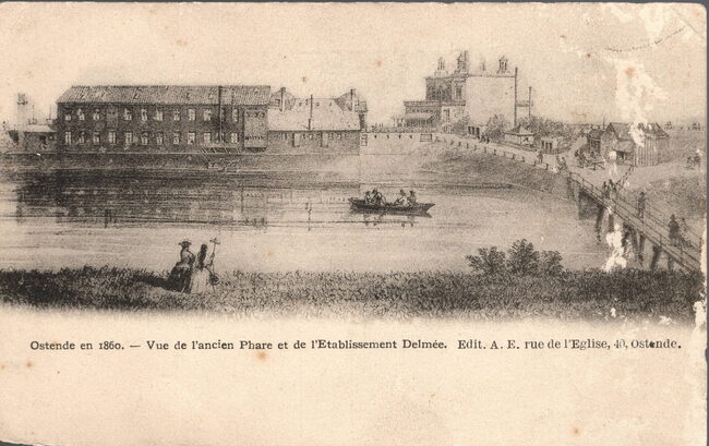 A. E. Ostende. - Ostende en 1860. Vue de l'ancien phare et de l'établissement Delmée.