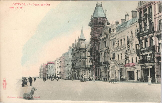 Albert Sugg/Excelsior 7, 22. - Ostende - La Digue, côté Est. - Bijgekleurde kaart. De Zeedijk richting havengeul. Vooraan rechts Hotel Alexandra.