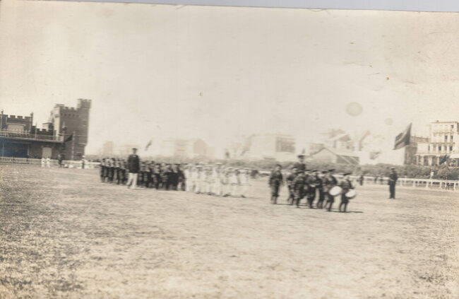 Vanaf augustus 1913 werd voor het eerst een militaire oefening gehouden. Links, detail van de duivenschieting Verdere literatuur : IBIS 1906-2006 : een koninklijk verhaal / Philip Declercq. 2007. p.106. Plate Bib…