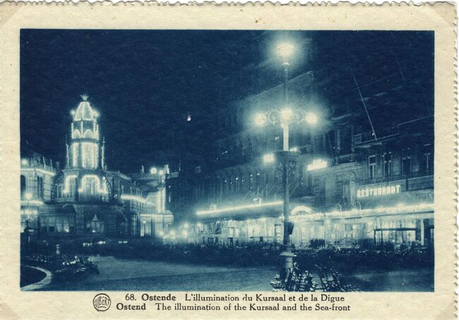AlbertDohmen 68. - Ostende - L'Illumination du Kursaal et de la Digue. Ostend - The illumination of the Kursaal and the Sae-front. - Nachtopname van de Zeedijk en detail van de westgevel van het derde Kursaal. Rechts…