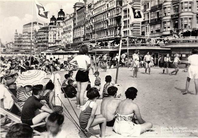 Albert Dohmen 4. - Ostende - La Plage et le Kursaal. Ostend - The Sands before the Kursaal. - Oostende in het interbellum. Strandrecreatie op het Groot strand. Op de achtergrond, de westgevel van het derde Kursaal langs…