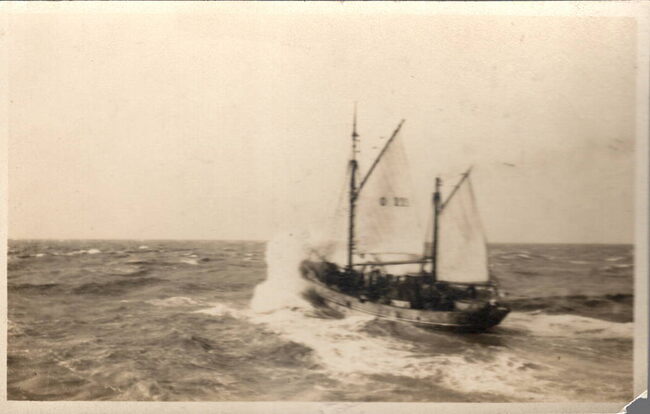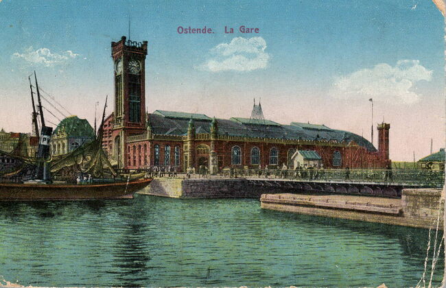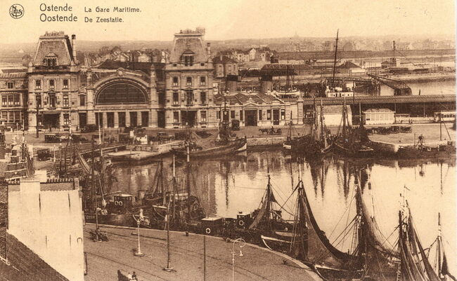 Ostende La Gare. - Bijgekleurde kaart Een vaartuig van de Pêcheries à Vapeur in het eerste handelsdok